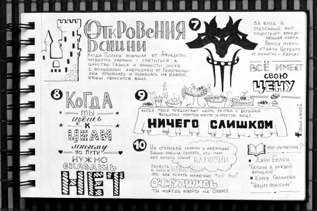 Миф об Эросе и Психее – это женская версия Пути героя. Героиня проходит через испытания, чтобы соединиться с возлюбленным. Как водится, по пути значительно взрослеет. В сети полно описаний и разных версий психологического анализа этой истории. Мы подробно разбирали этапы мифа на мастер-классе в 2016 году. С тех пор у меня остался визуальный конспект о самых важных идеях.