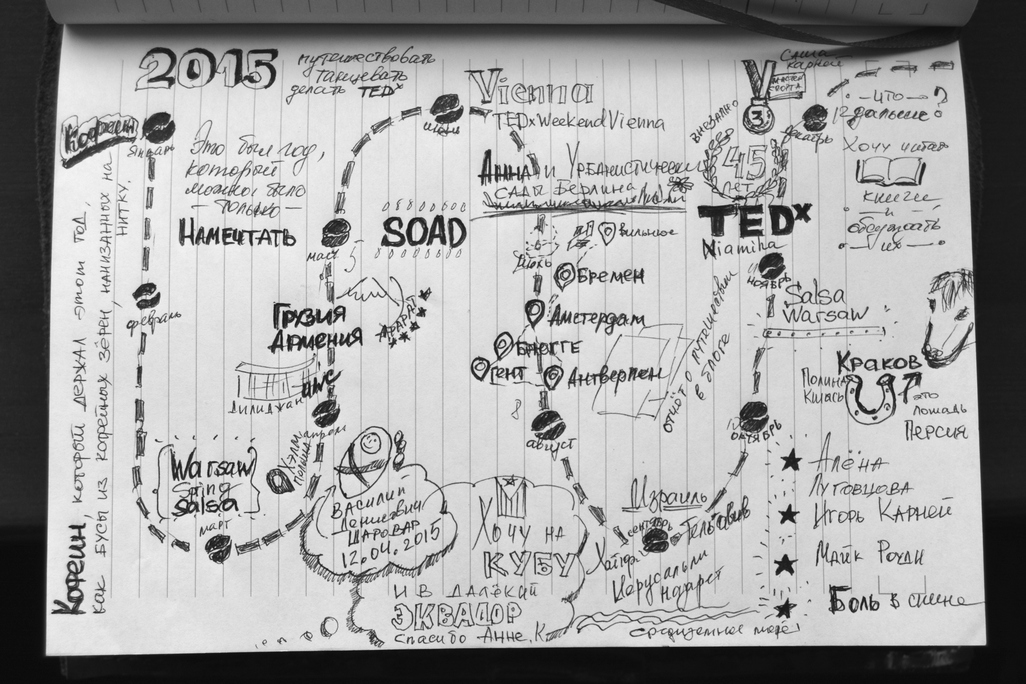 Иногда мне приходит в голову нарисовать свой прошедший год. Всегда это быстрый скетч, не очень аккуратный, буквально на коленке. И всегда он классный. Потому что за год столько всего происходит и когда видишь все знаковые события и места на одной страничке, то как будто собираешь свой год в историю.