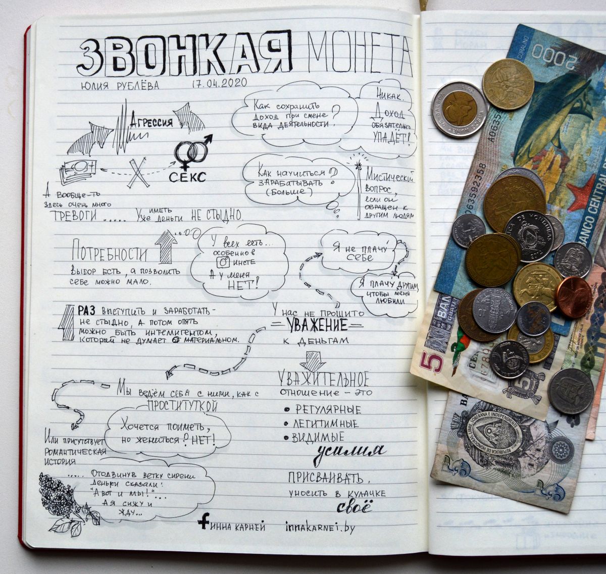 Рисованный конспект Юлии Рублевой "Звонкая монета" о наших непростых отношениях с деньгами.